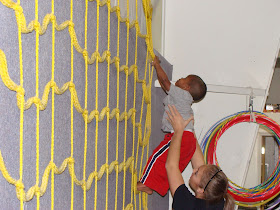 William is getting much better at climbing. His instructor had to hold him back to keep him from climbing above her reach.